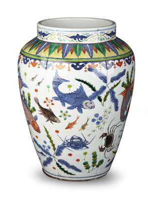the ovoid lobed body with underglaze blue decoration and overpainted in enamels, with swimming cup and other exotic fish, six character marks