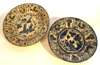 the well decorated with birds and blossom with four shaped panels of peacock feathers and precious objects, 32cm diameter; together with another Kraak dish, the well decorated with two figures and fan shaped panels (2)