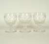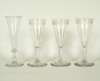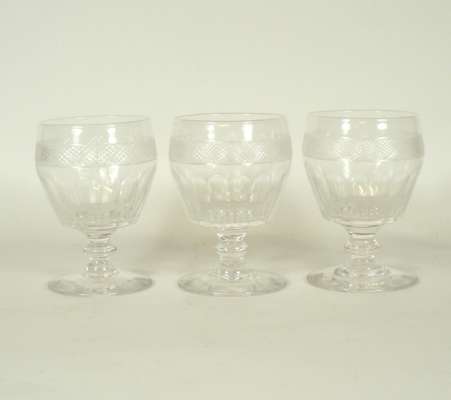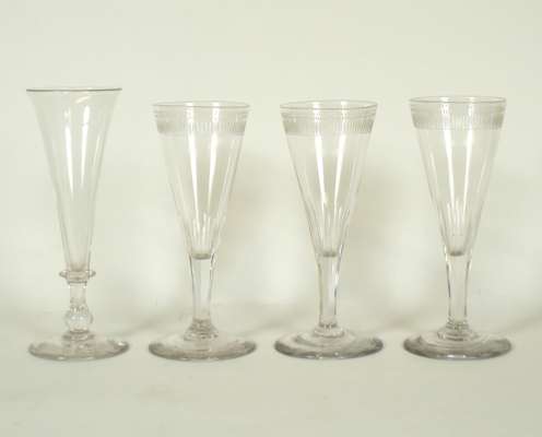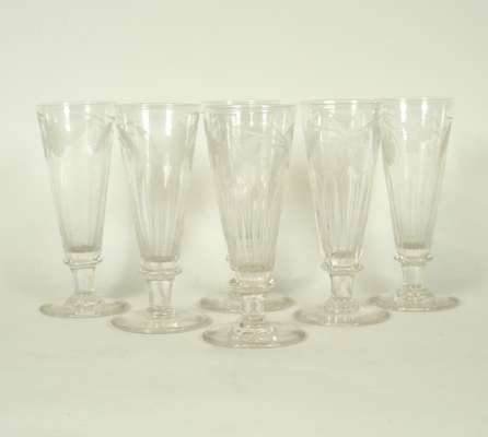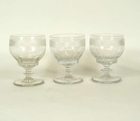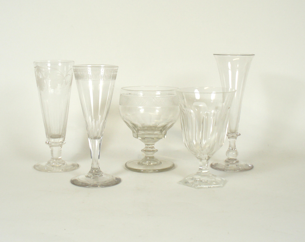 comprising: six ale glasses, each with funnel bowl and etched wheat and foliate design, plain stem and foot, 16.5cm high; six matched rummers each with diamond cut border, knopped stem and plain foot, 12.5cm high; three ale glasses each with faceted funnel bowl, cut border and conical foot, 16.5cm high; two faceted goblets with hexagonal faceted stem and foot, 13cm high; and an ale glass with funnel bowl, knopped stem and plain foot, 17.5cm high (18)