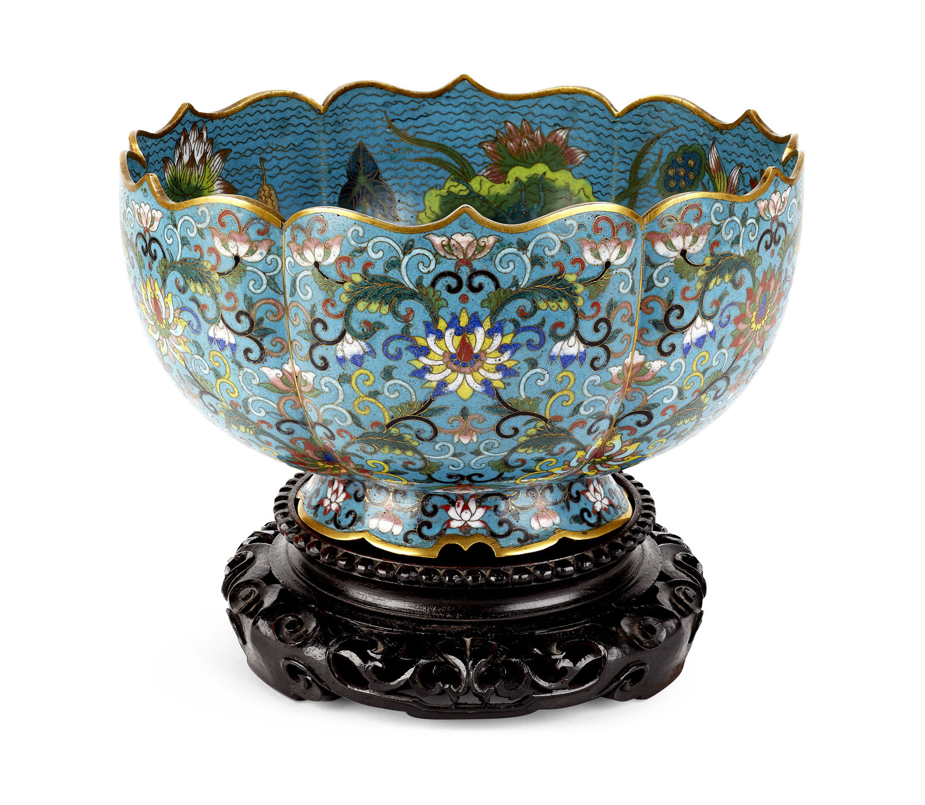 the bowl of circular lobed form with shaped rim, decorated in polychrome on a blue ground, the well decorated with a lotus, surrounded by a border of lotus and pond weeds, the exterior with stylised lotus and scroll decoration, hardwood stand