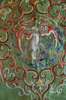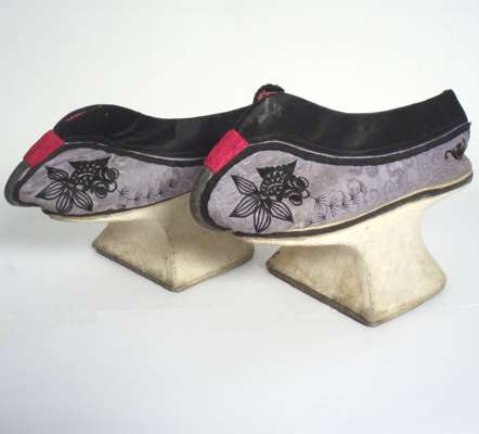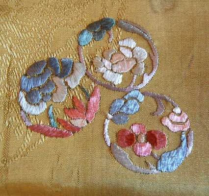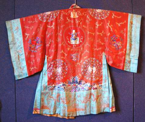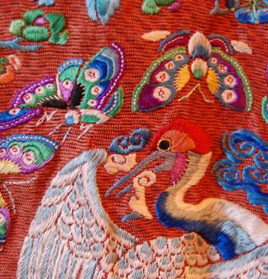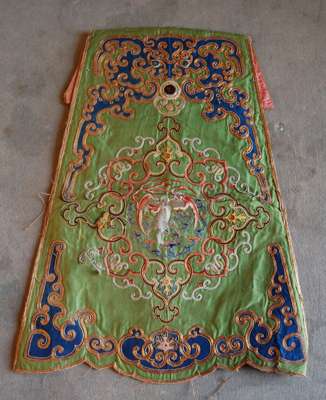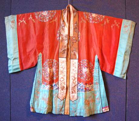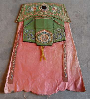 comprising: a lady's wedding gown, in red and green, decorated with phoenixes, butterflies and flowers; a mustard yellow wall hanging with central landscape scene and floral sprays; a green panel decorated with a bat and scrollwork; a panel of a figures in a landscape; and a pair of stacked sole shoes (6)