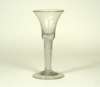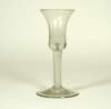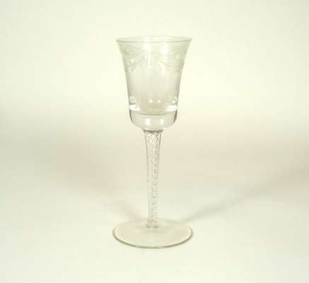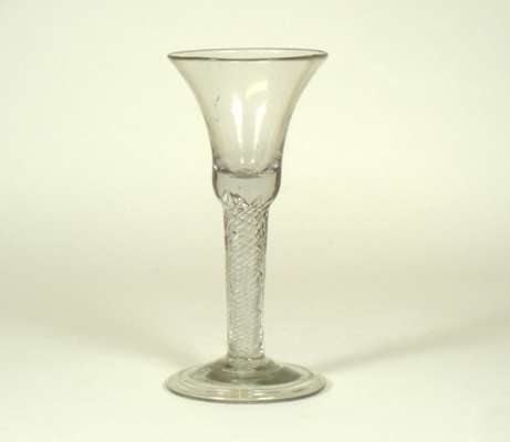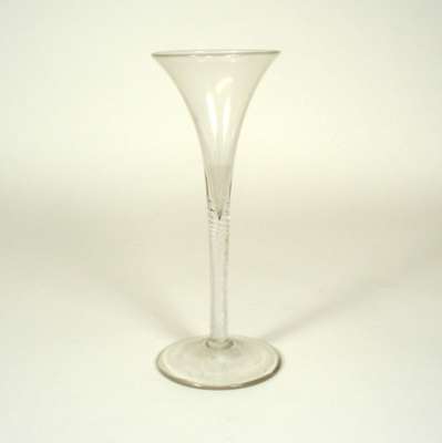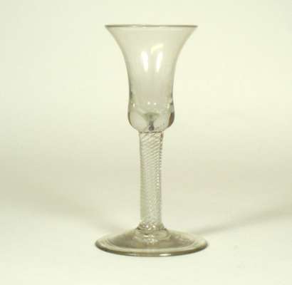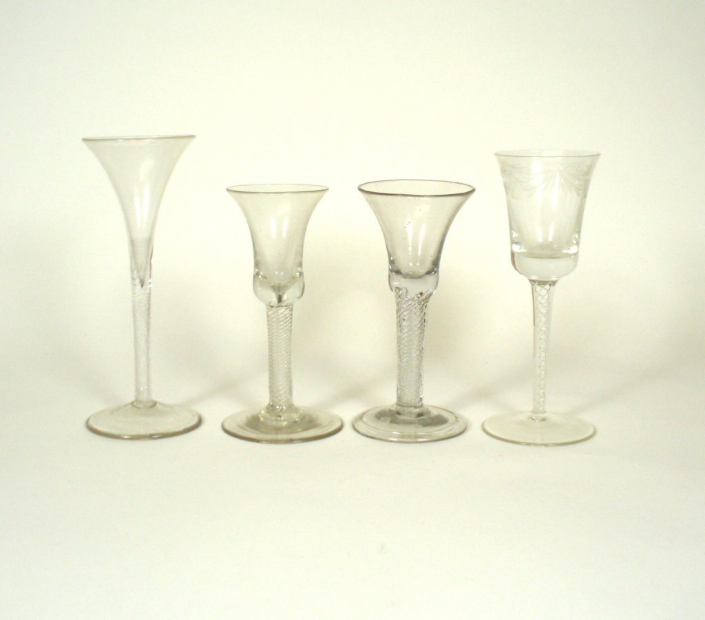 each with bell bowl and folded foot, 15cm high and 15.5cm high; a later tall glass with trumpet bowl, multi spiral twist stem, 18cm high; and a later Continental glass with bell bowl, multi spiral twist stem and conical foot, 17.5cm high (4)