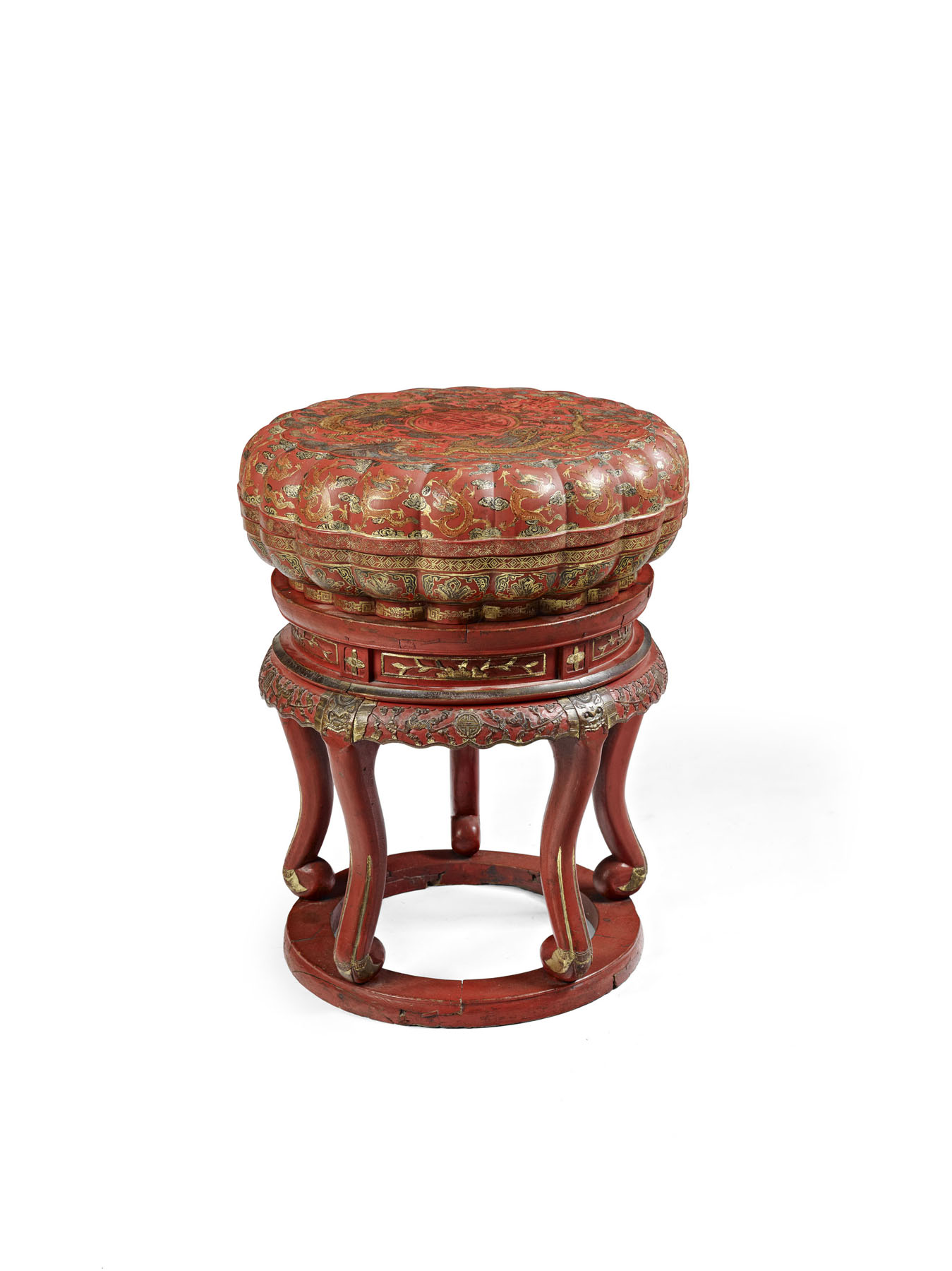 with parcel gilt chinoiserie decoration throughout, the lobed circular box with a lifting lid, raised on four cabriole legs united by a peripheral stretcher