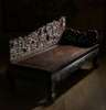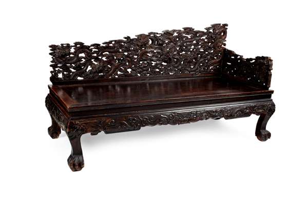 the pierced back carved in high relief with scrolling dragons, clouds and foliage above a panelled seat, raised on cabriole legs surmounted by masks and ending in claw and ball feet