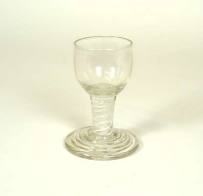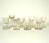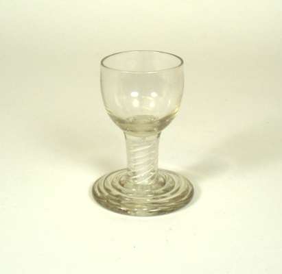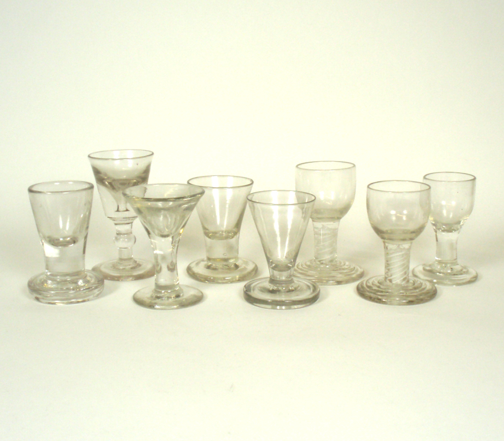 comprising: an ogee bowl with double opaque twist stem and beehive foot, 9.5cm high; a similar glass, 9cm high; a plain glass with funnel bowl, 8.5cm high; two similar glasses, 8cm and 9cm high; a plain glass with ogee bowl, 9cm high; a sham dram glass with bucket bowl, knopped stem and plain foot, 10.5cm high; and a sham dram glass with trumpet bowl, plain stem and foot, 9cm high (8)