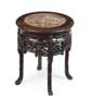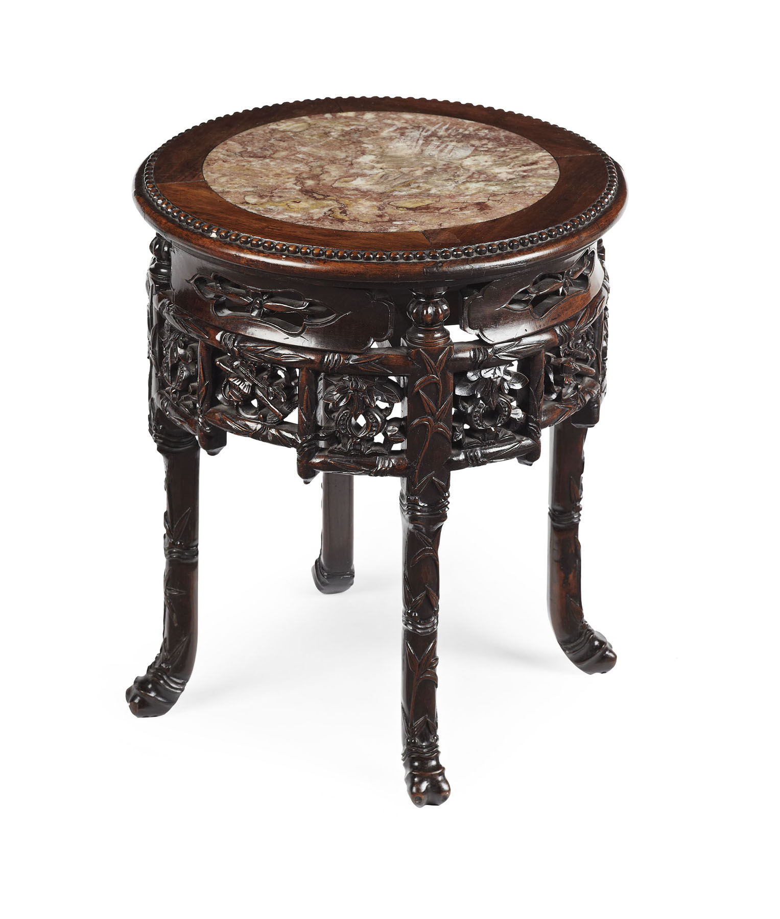 the bead moulded circular marble inset top above a foliate carved openwork frieze, raised on bamboo carved splayed legs