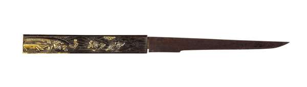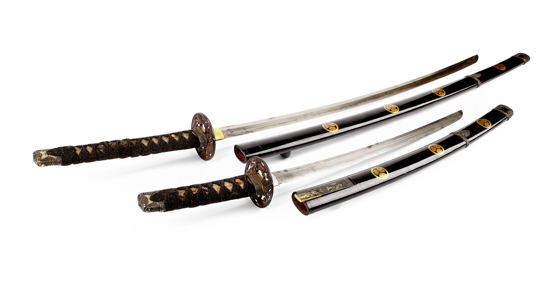 the katana with tempered single edged blade, gilt metal habaki and seppa, the white ray skin grip bound in traditional cord enclosing a menuki on each side of a grotesque beast, gilt metal tsuba decorated with seated figures and warriors, signed; the pommel of pierced and decorated gilt metal, contained in its black lacquer scabbard with gilt oak leaf mon design, blade 69cm long; the wakizaishi with tempered single edged blade, white metal habaki, gilt metal seppa, the white ray skin grip bound in traditional cord enclosing a menuki on each side of a grotesque beast, gilt metal tsuba decorated with figures, contained in its black lacquer scabbard with oak leaf mon design and enclosed kozuka with signed blade and grip decorated with figures swimming, wakizaishi blade 45cm long, kozuka blade 11cm long (2)
