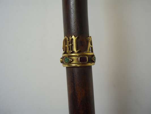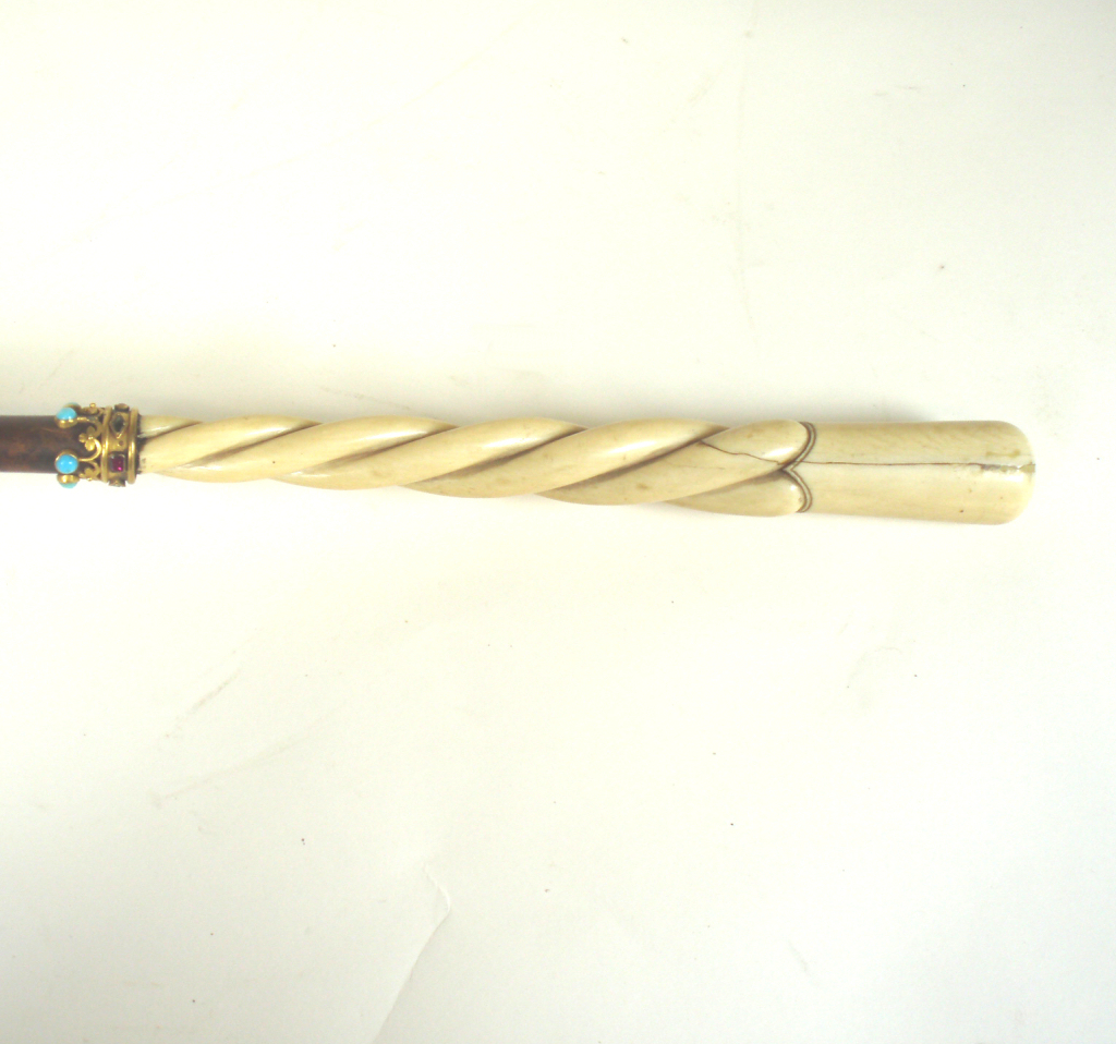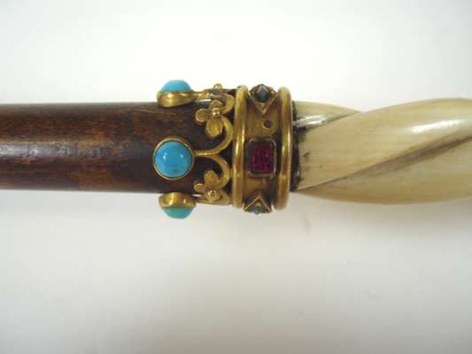 with gold and jewelled coronet mounts and carved ivory handle