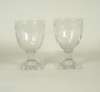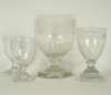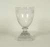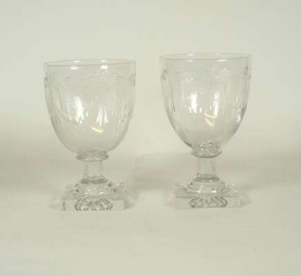 faceted bowl with etched floral and wheat design, waisted stem and stepped foot, 22cm high; a rummer with faceted bowl and stem and with a stepped square base, 17cm high; and a pair of rummers with cut floral swags, plain stem and square foot, 14.5cm high (4)