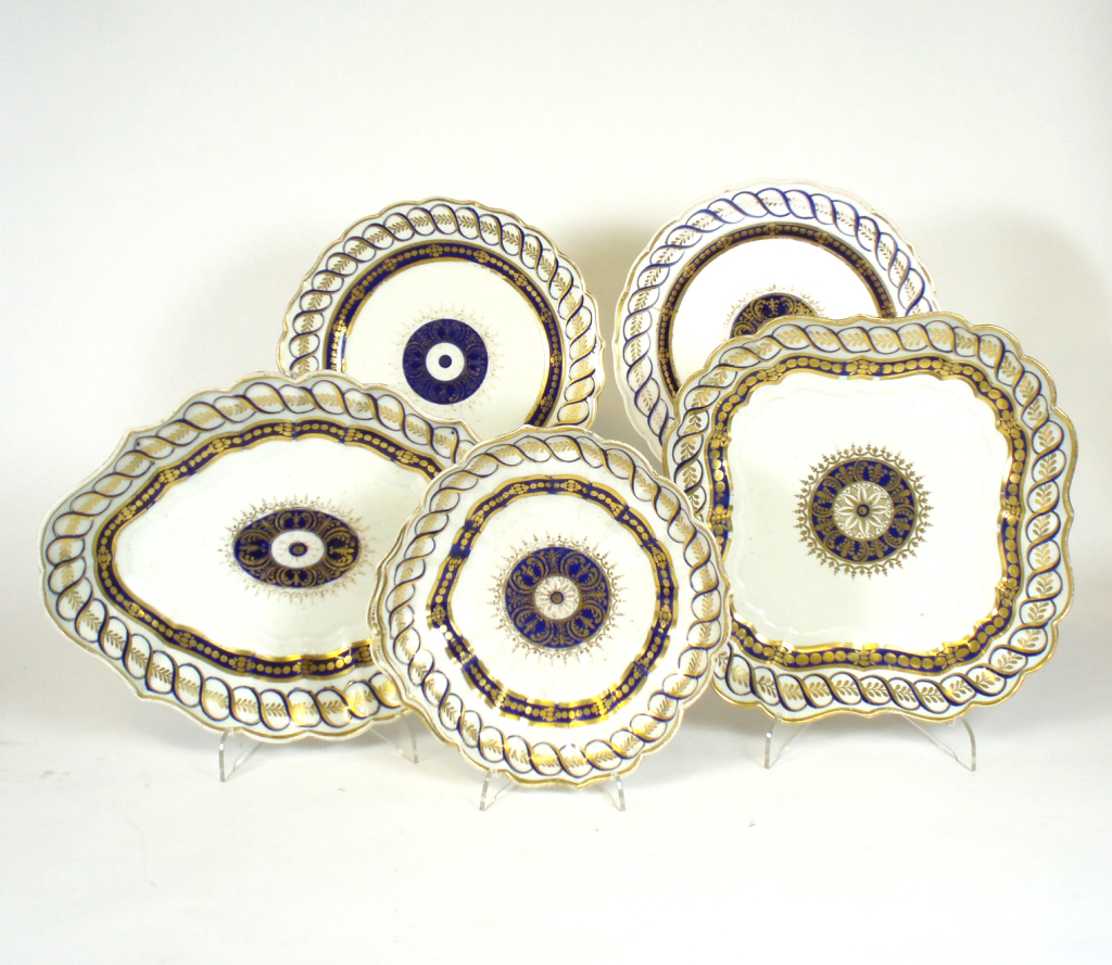 each item with blue border and gilt highlights, blue crescent mark, comprising: five square dishes, three oval dishes, two shaped dishes and thirty plates (40)