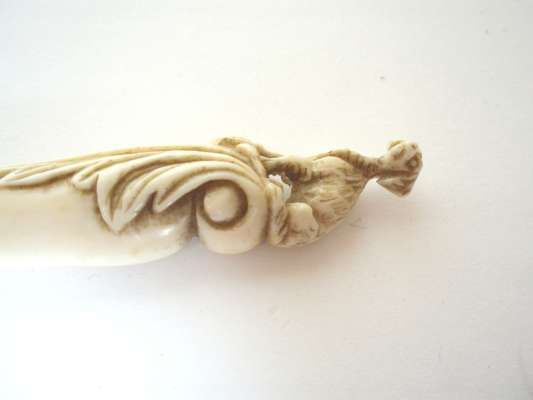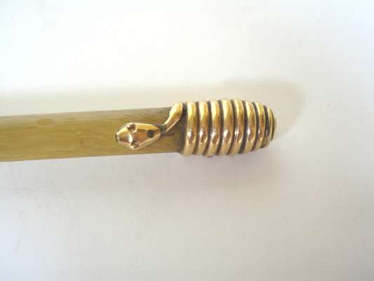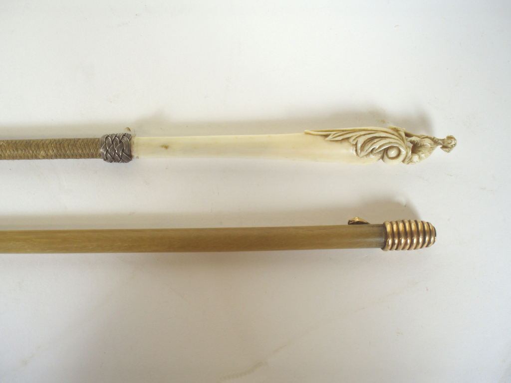 comprising: a whip bound with threads and with a carved ivory dog and acanthus leaf handle, 65.5cm long; and a horn whip with gold serpent handle, 61cm long