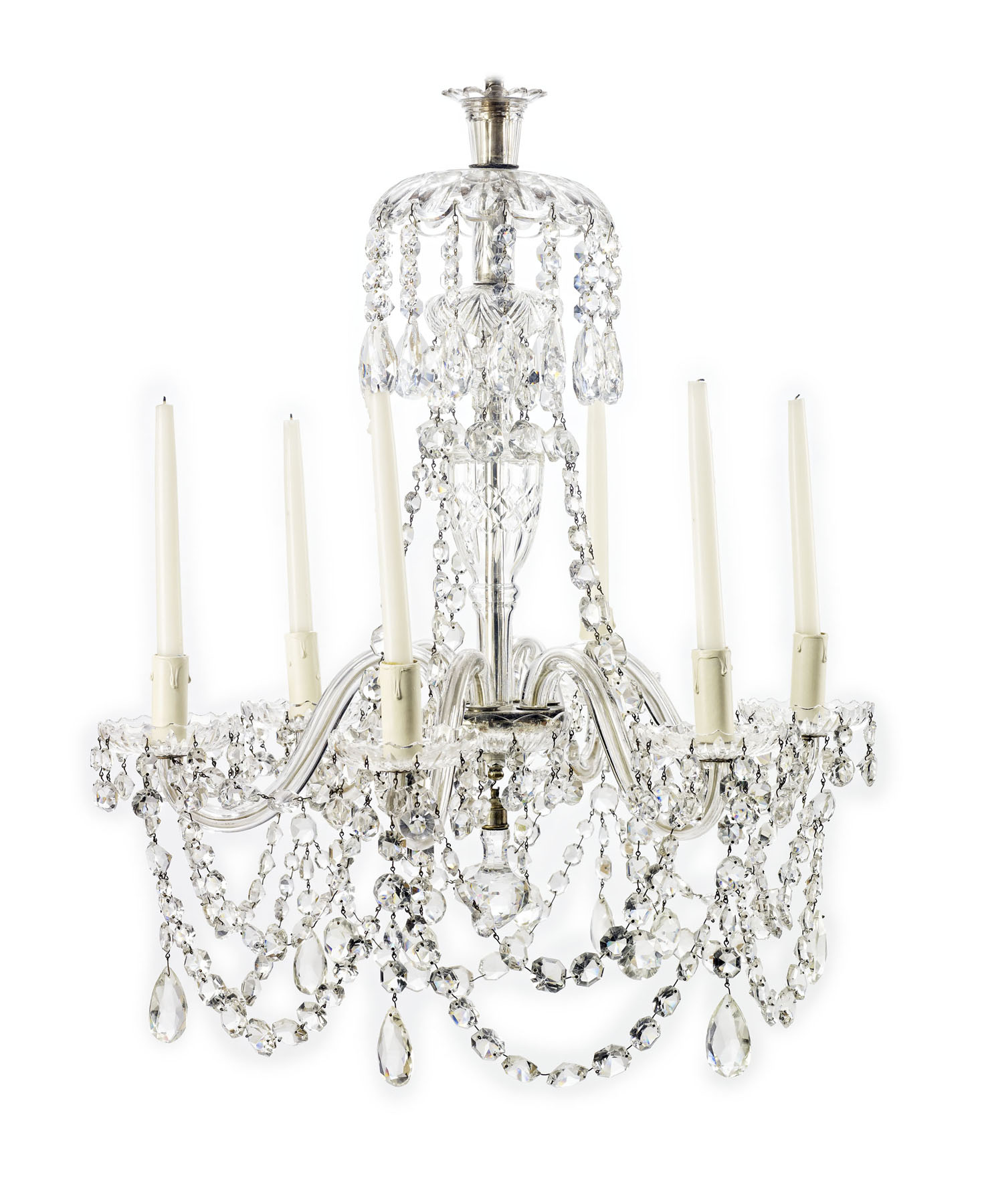 the domed coronet hung with pear shaped drops, above a vase form stem from which issue six outscrolling branches, fitted for electricity