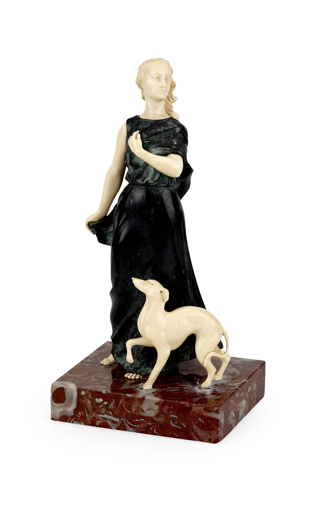 BRONZE AND IVORY FIGURE OF A LADY AND HER DOG
