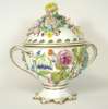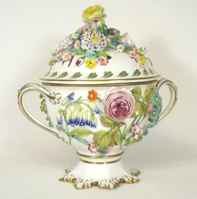 of twin handled urn form with reticulated cover, applied allover with polychrome painted flower decoration and gilt highlights, gilt mark '1580'