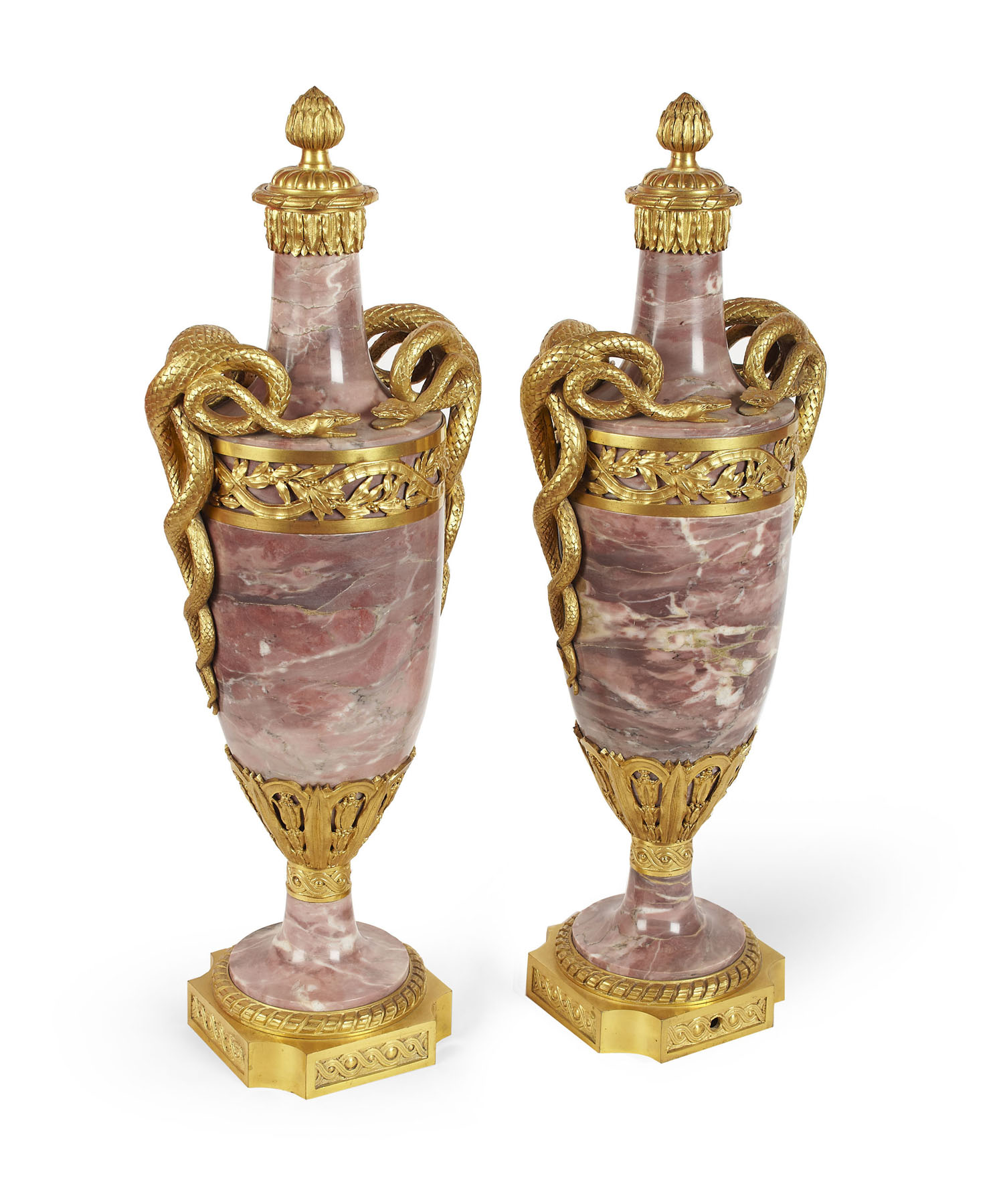 in the Louis XVI style, each with gilt metal artichoke finial, the body of baluster form with a tapering neck the whole decorated with a gilt metal laurel leaf upper border and scrolling double handles in the form of entwined serpents, with guilloche and ribbon borders to the base (2)
