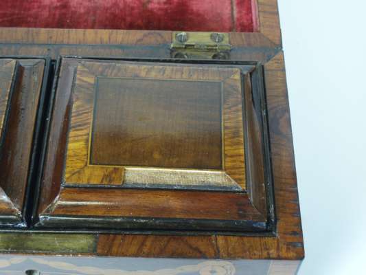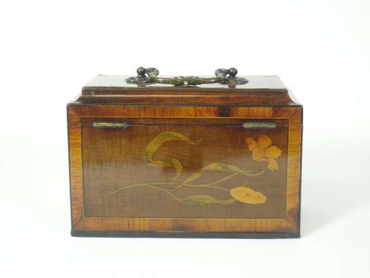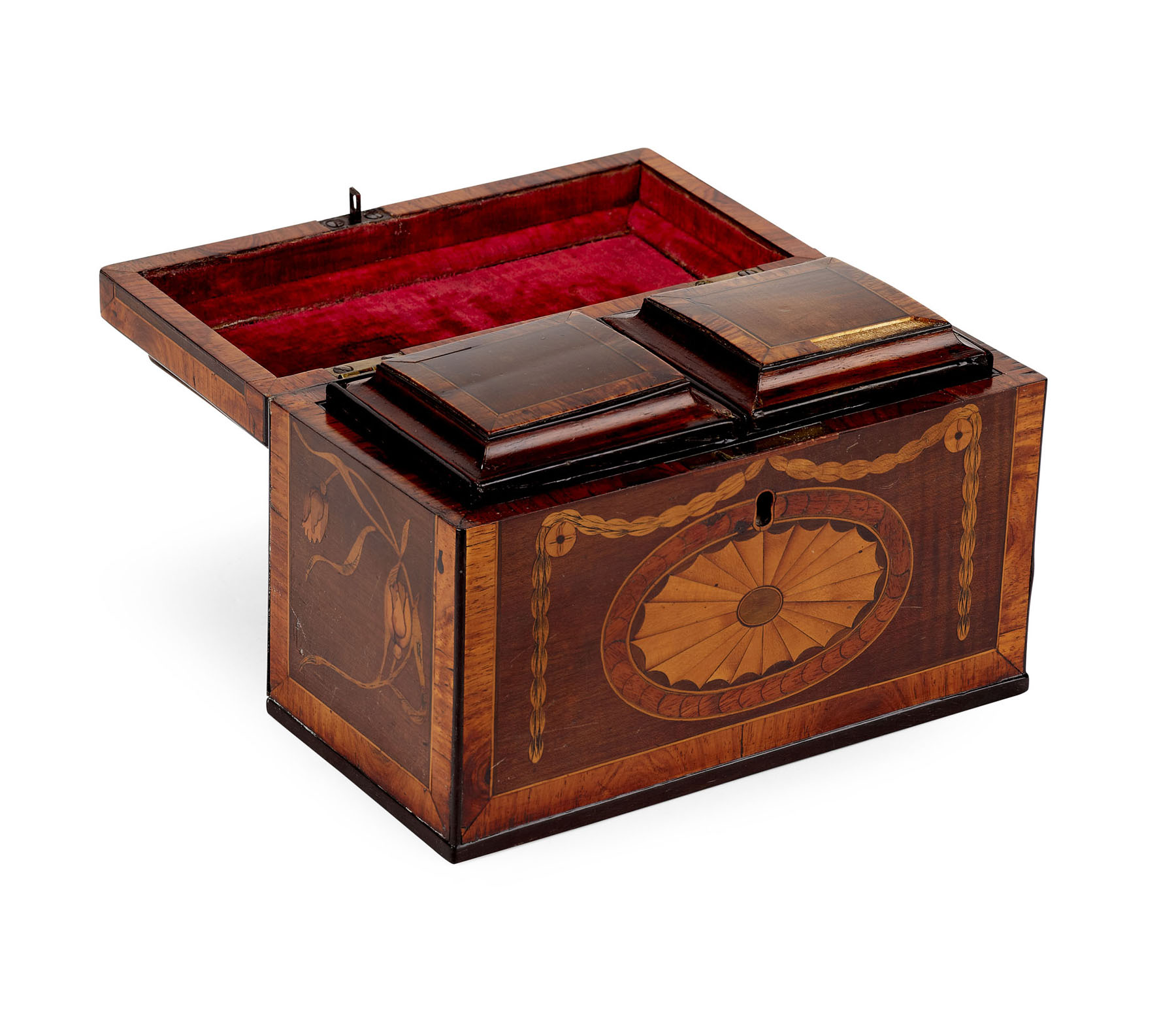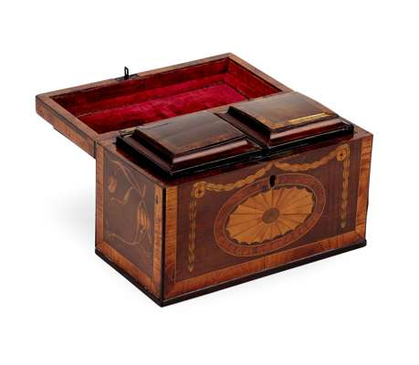 domed top with a brass bail handle, the rectangular body inlaid with paterae and swags, the interior fitted with two removable covered mahogany tea containers