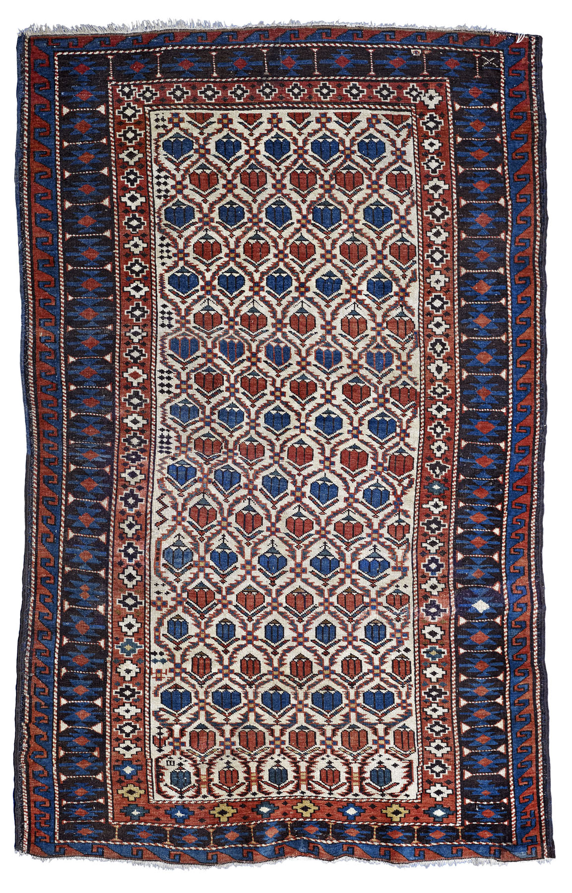 the cream field with allover pattern of stylised flowerheads in serrated lattice, within brown serrated lozenge and bar border between red star and wave scroll bands