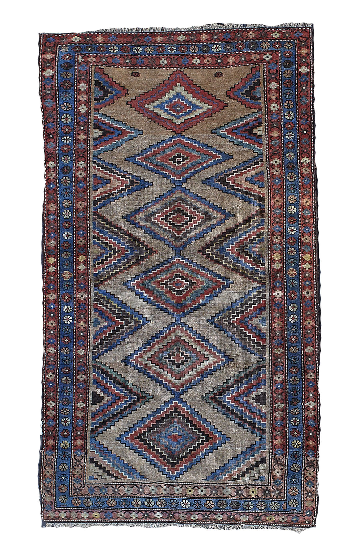 the camel field with six stepped polychrome lozenge medallions, similar half medallion sides, within triple red and blue rosette and vine borders