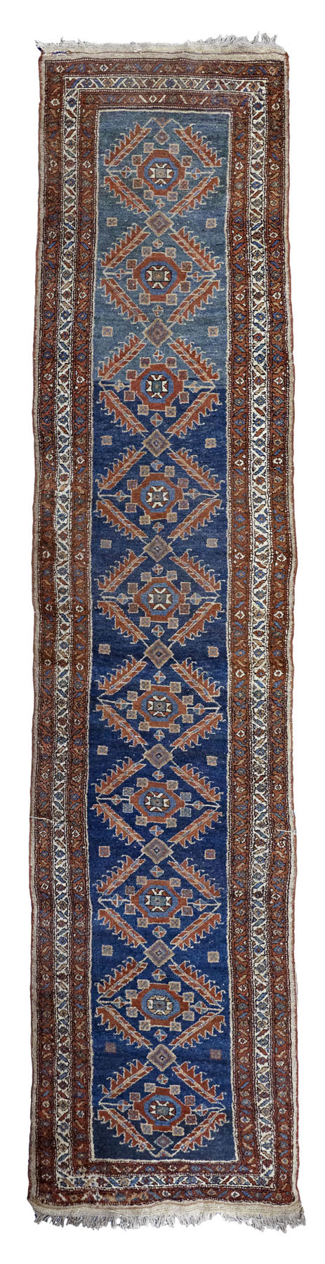 the abrash blue field with ten rosette medallions within red serrated leaf lattice, within triple red and ivory vine borders