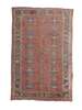 the pink field with two columns of grey-blue palmettes flanking a column of cruciform motifs, within grey-blue cartouche, rosette and vine border between cream and green bands