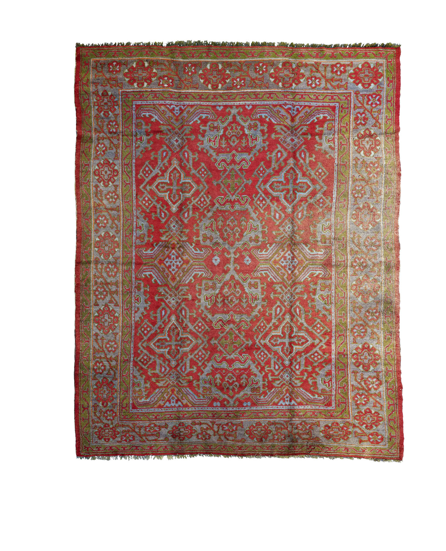 the red field with central column of palmette motifs flanked by two columns of cruciform motifs, within slate-grey rosette and diagonal vine border between olive bands