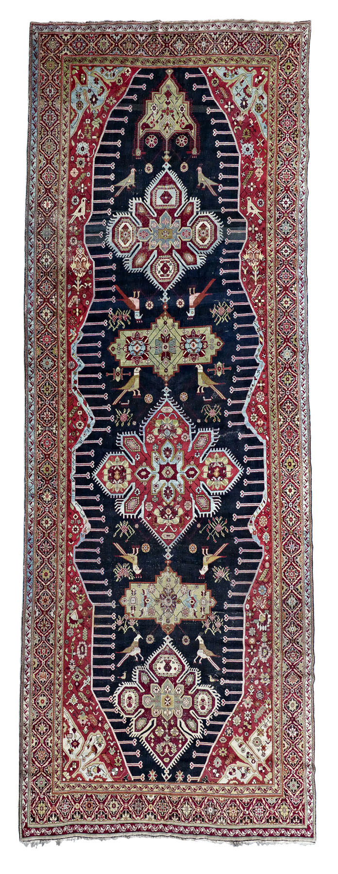 the dark indigo field with Karabagh design of three cusped and two oblong polychrome medallions, arrowhead to one end and interspersed with bird motifs, long red and blue spandrels, within raspberry rosette lozenge lattice border between green and blue bands