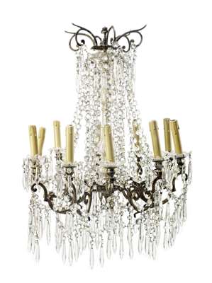 the scroll coronet hung with faceted swags, above a baluster stem form which issue twelve outscrolling branches