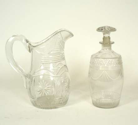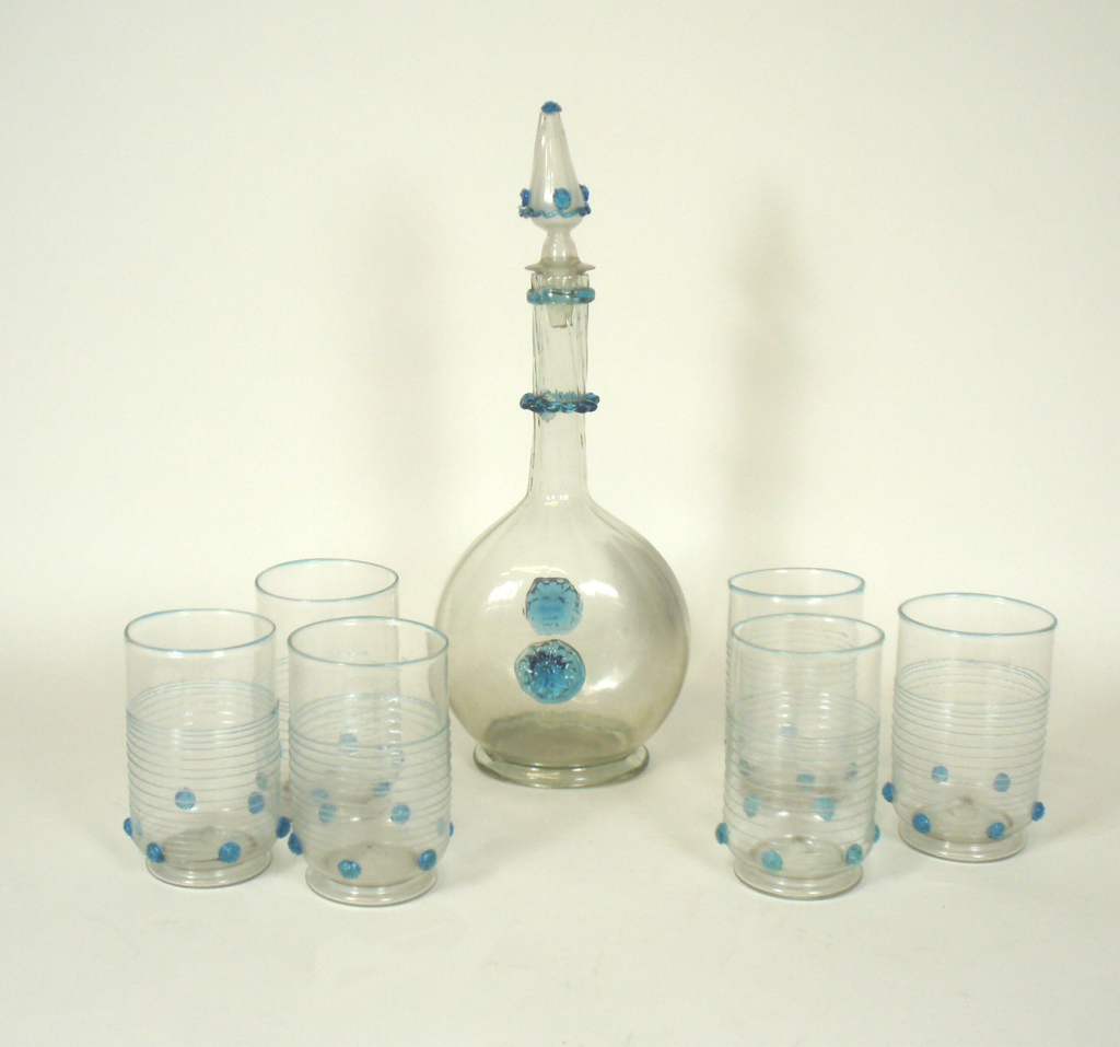 comprising: six amber roemmers, each with blue prunt decoration, 13.5cm high; six clear glass beakers, each with blue prunt decoration, 10cm high; a matching decanter and stopper, 19cm high; a cut glass jug with star and diamond design, 18cm high; a small decanter and matched stopper, 19cm high; three glasses with faceted funnel bowl, annular knop, plain base, 12.5cm high; and two bell bowl glasses with knopped stem and plain foot, 12cm high (20)