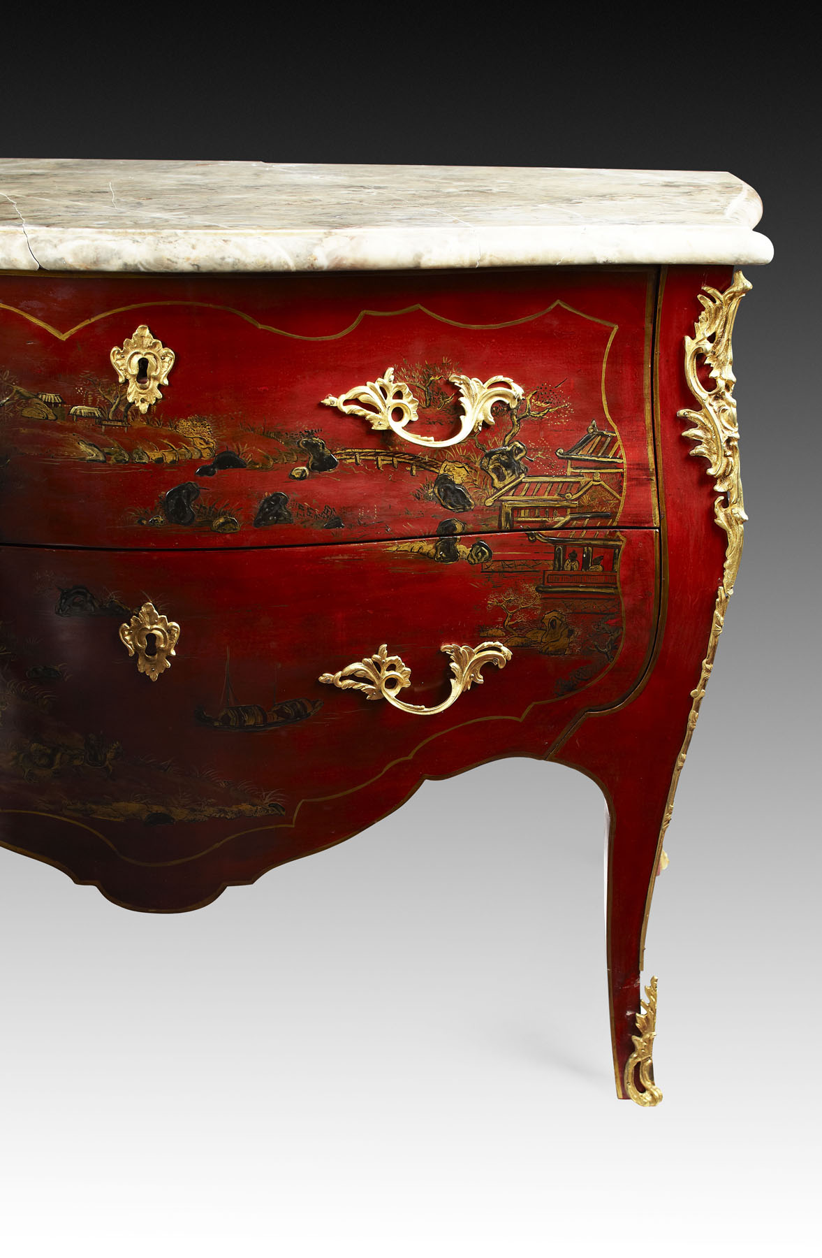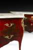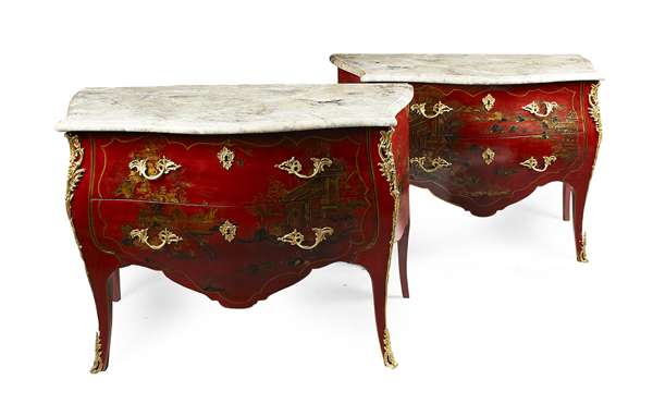 PAIR OF LOUIS XV STYLE RED LACQUER BOMBE COMMODES