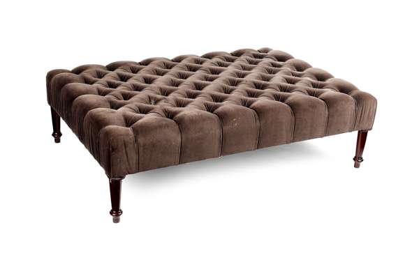 the rectangular button-tufted top in grey plush, raised on turned mahogany legs