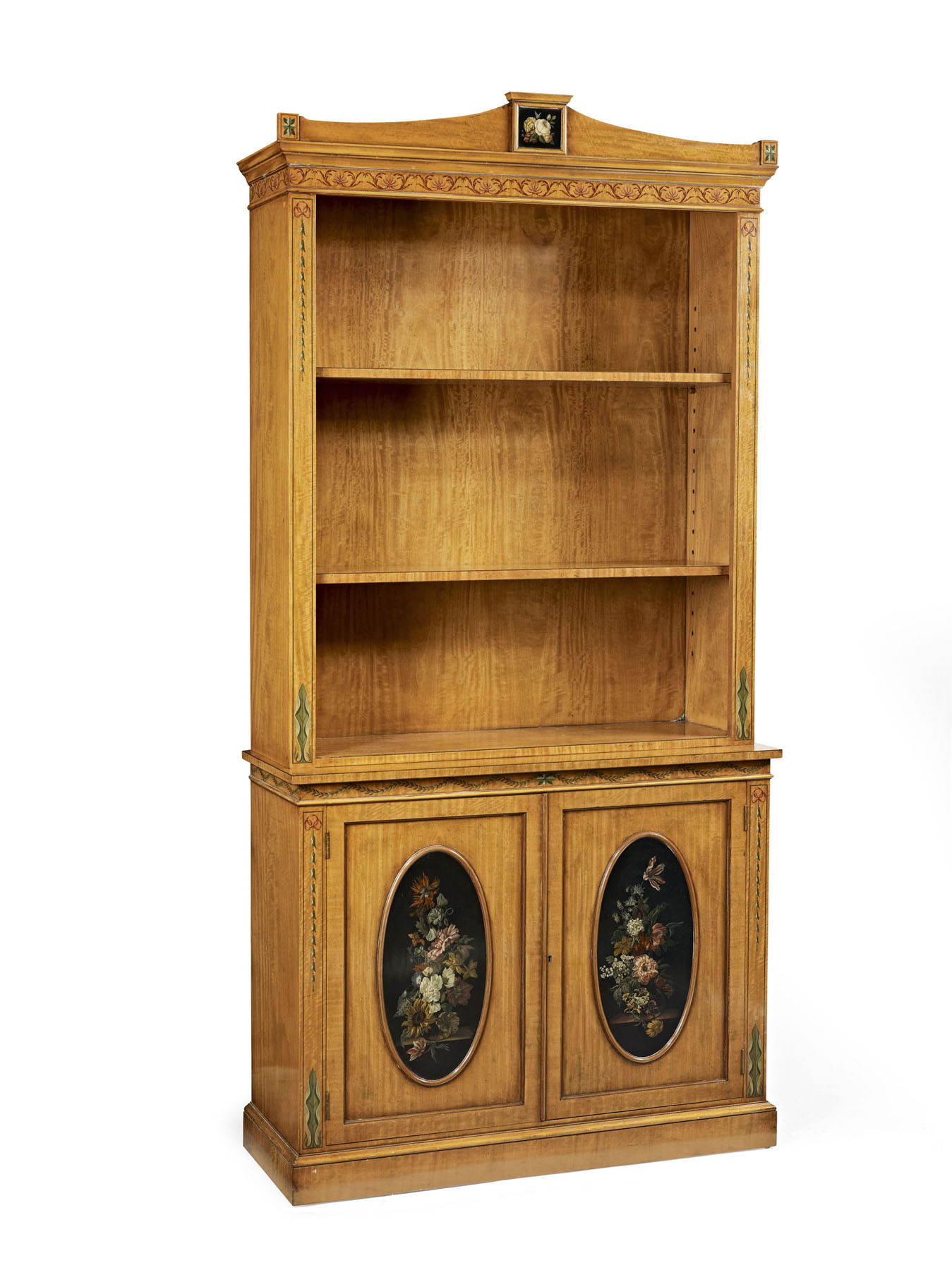 the moulded cornice with a shaped pediment above open adjustable shelves, the lower section with two cupboard doors centred by painted still life oval panels, raised on a plinth base
