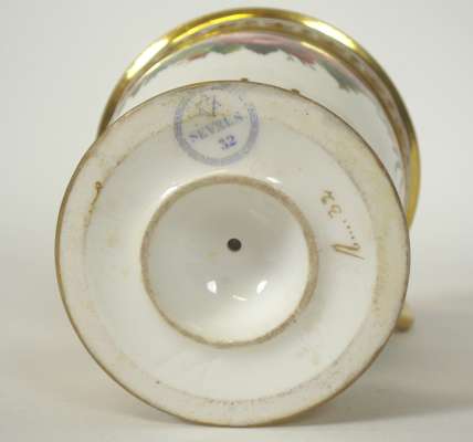 each item with a polychrome painted border of flowers between stylised floral decorated gilt bands, inscribed marks, blue printed mark, dated 1832 (2)