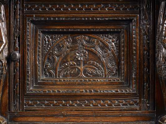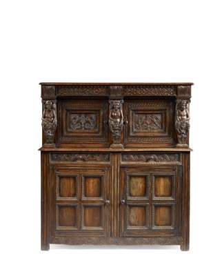 GOOD CHARLES II CARVED OAK COURT CUPBOARD