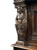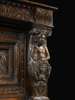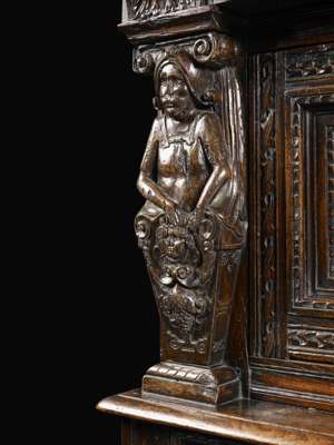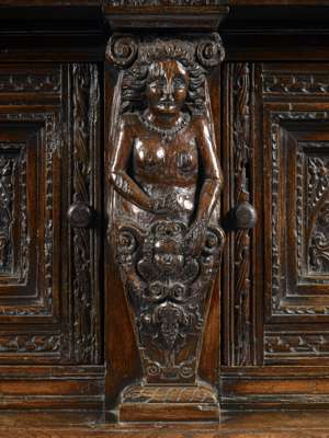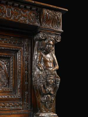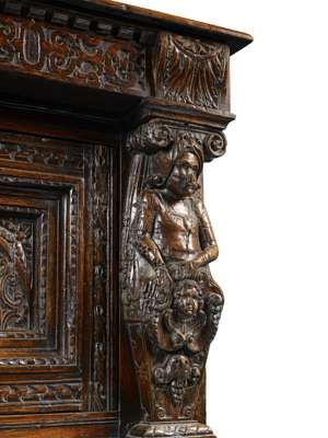 the moulded rectangular top above a dentil and blind fret carved frieze, over two foliate carved panelled cupboard doors flanked and divided by caryatid Doric form pilasters, the lower section with two lunette carved frieze drawers above two multi panelled cupboard doors, raised on stile feet