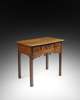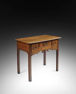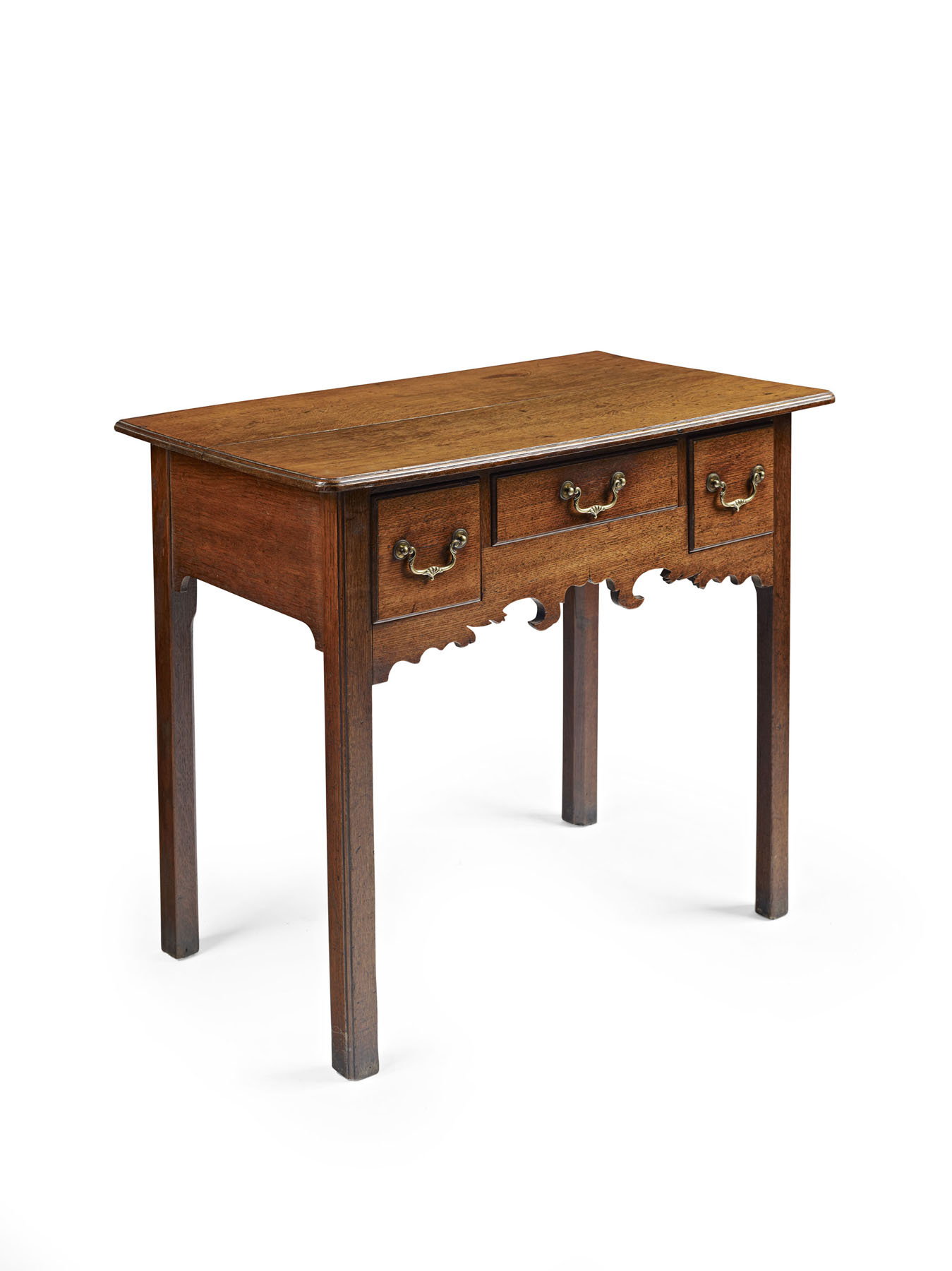 the rectangular top with a moulded edge over three short drawers and a scrolled apron, raised on squared straight legs