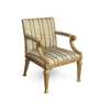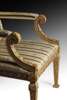 the rectangular back issuing straight arms with scrolled hand-holds over a padded seat with a Vitruvian scroll carved seat-rail, raised on carved square tapered legs; one in striped upholstery, the other in green damask