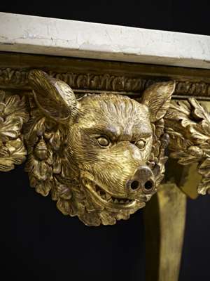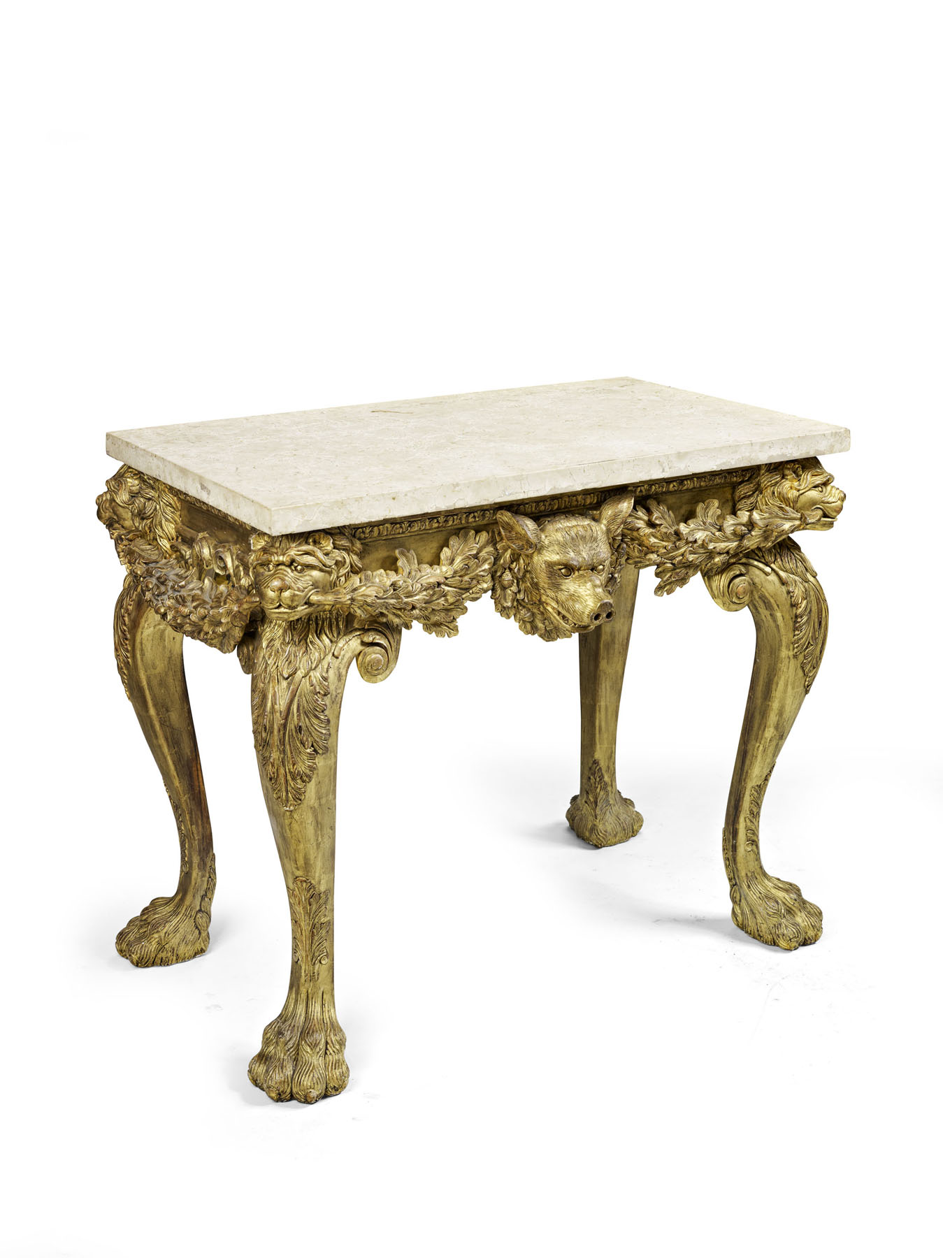 the white poured stone rectangular top over a deep frieze centred by a boar mask and hung with fruiting garlands, raised on acanthus carved cabriole legs terminating on paw feet