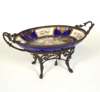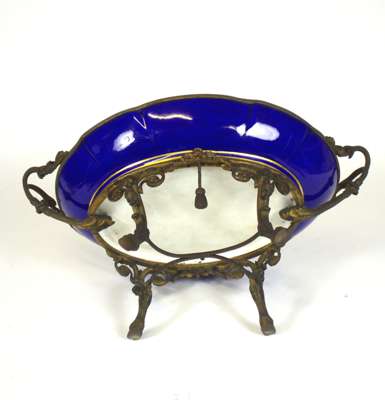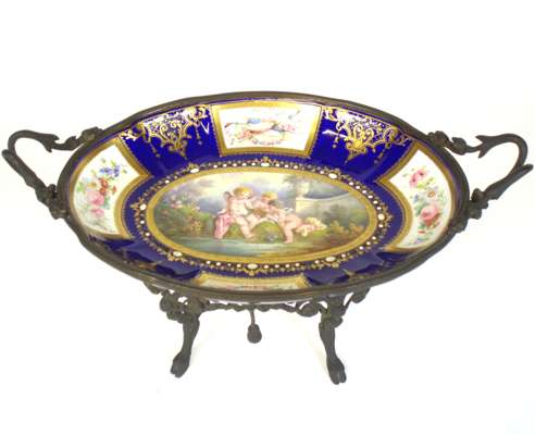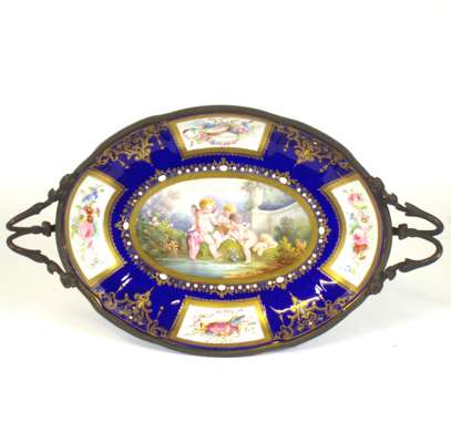 the porcelain dish of oval form with a central panel polychrome painted with putti playing in a garden, four border panels painted with floral sprays and hunting trophies, on a blue jewelled ground with gilt highlights, fitted to a twin handled gilt metal stand with four hoof feet