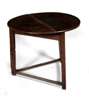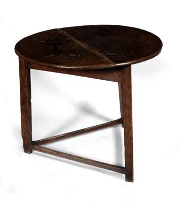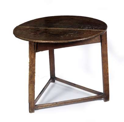 the plain circular top over a plain frieze raised on three angled legs joined by a peripheral stretcher