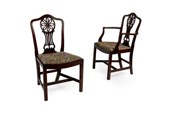 including two armchairs, with pierced wheel back splats and drop-in seats raised on square chamferred legs united by H shaped stretchers