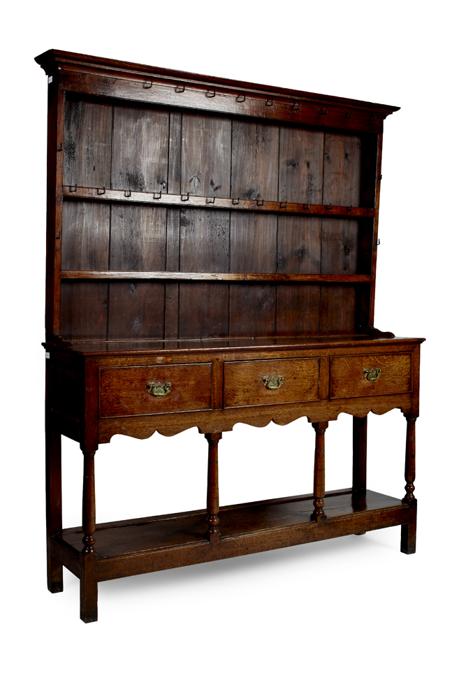 the shelved superstructer above three frieze drawers, raised on baluster turned legs united by an undertier