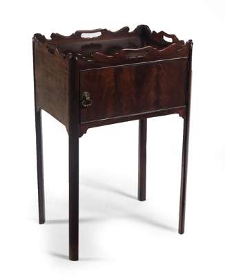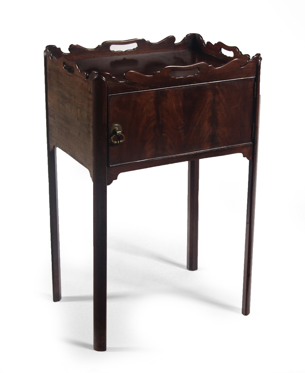 the rectangular top with a shaped gallery above a single cupboard door, raised on quarter round straight legs