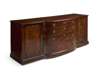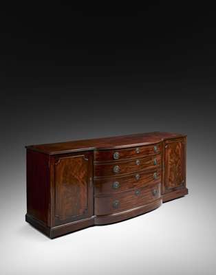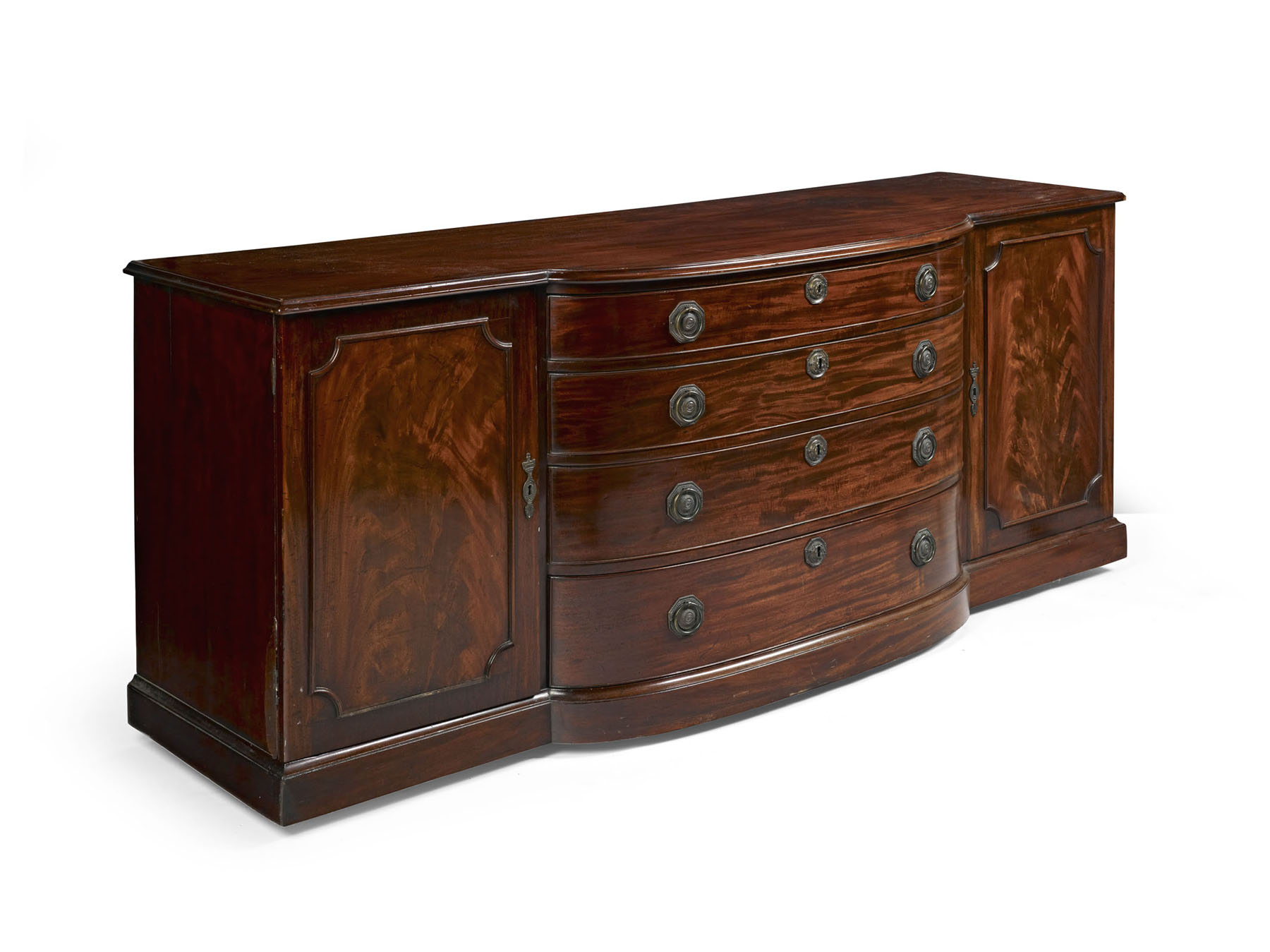 the rectangular top with a bowfront centre containing four graduated drawers, flanked by moulded cupboard doors, on a plinth base