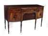 the crossbanded top with a reeded edge above a central frieze drawer and tambour cupboard base, flanked by curved frieze drawers and a deep cellarette cupboard and drawer to either side, raised on reeded circular legs
