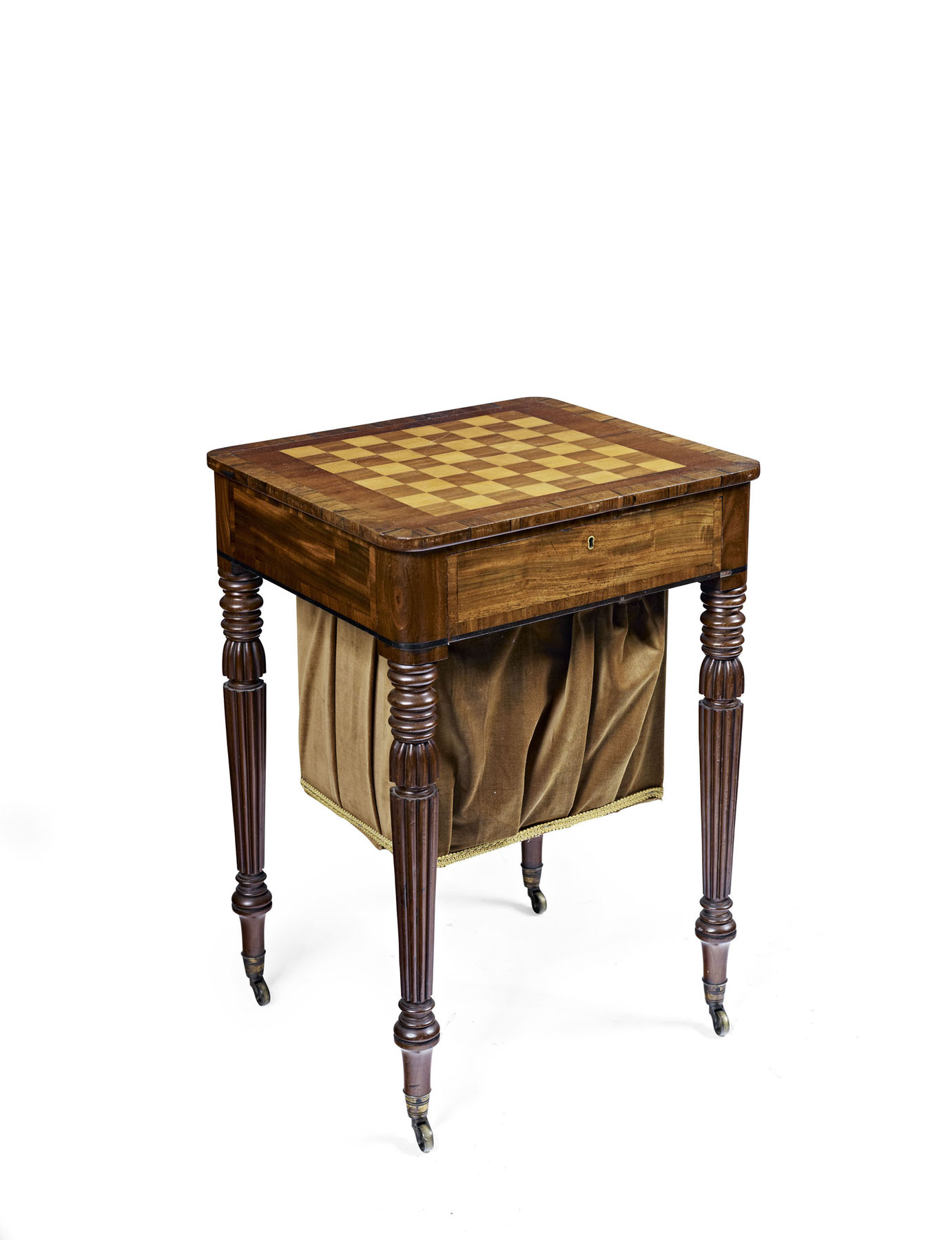 the crossbanded rounded rectangular top with a parquetry games board above a frieze drawer, opening to reveal a ratchet adjustable writing surface and a deep work bag drawer, raised on reeded turned tapered legs ending in brass cappings and castors
