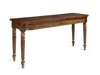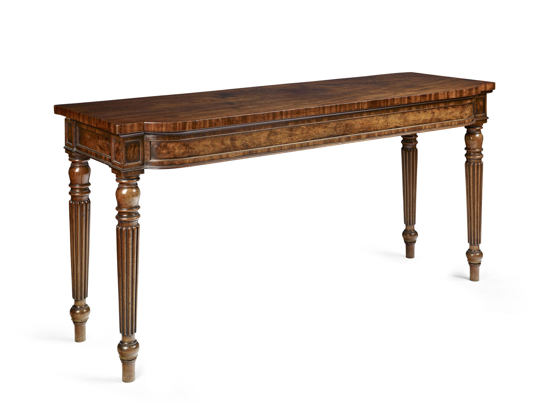 The long demilune top with square forecorners over a plain frieze with a moulded edge, raised on tapering turned and reeded legs