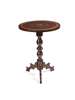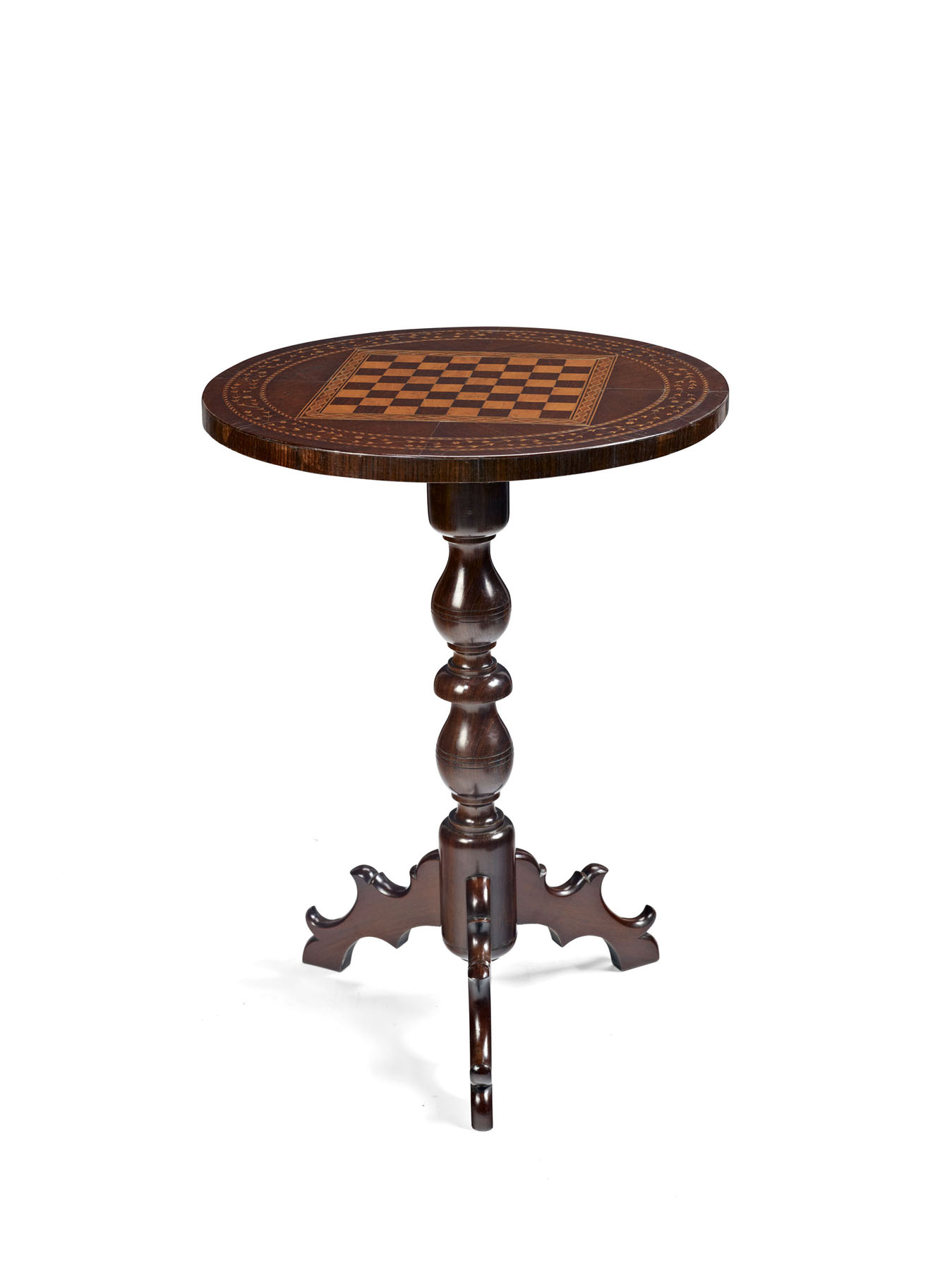the circular tops inlaid with a games board and a Maltese cross within a chevron and floral garland border, raised on baluster turned column supports and ending on three shaped downswept feet (2)