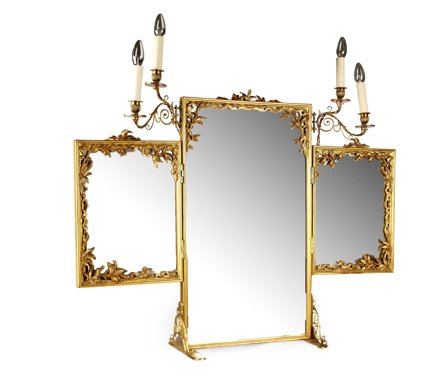 of rectangular form with two wing sections, each section with carved foliate and berry decoration to the crest and mounts with two double branch gilt metal scrolled sconces to either side, standing on scrolled gilt metal feet