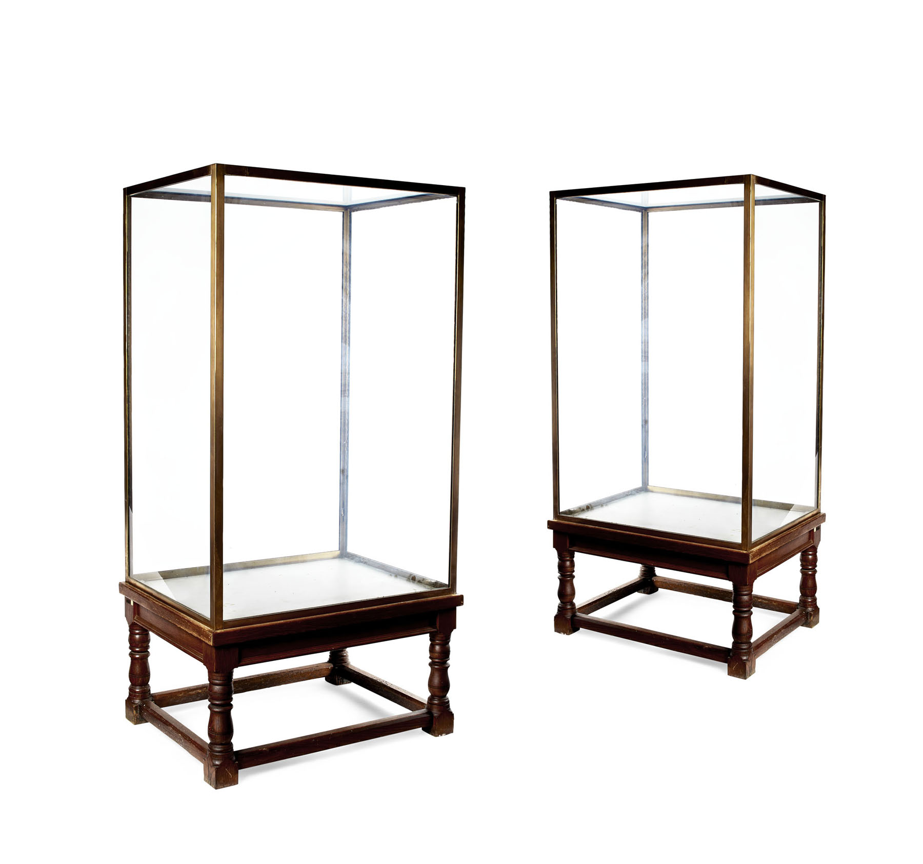 the upright rectangular metal framed glazed cases on turned oak supports united by stretchers