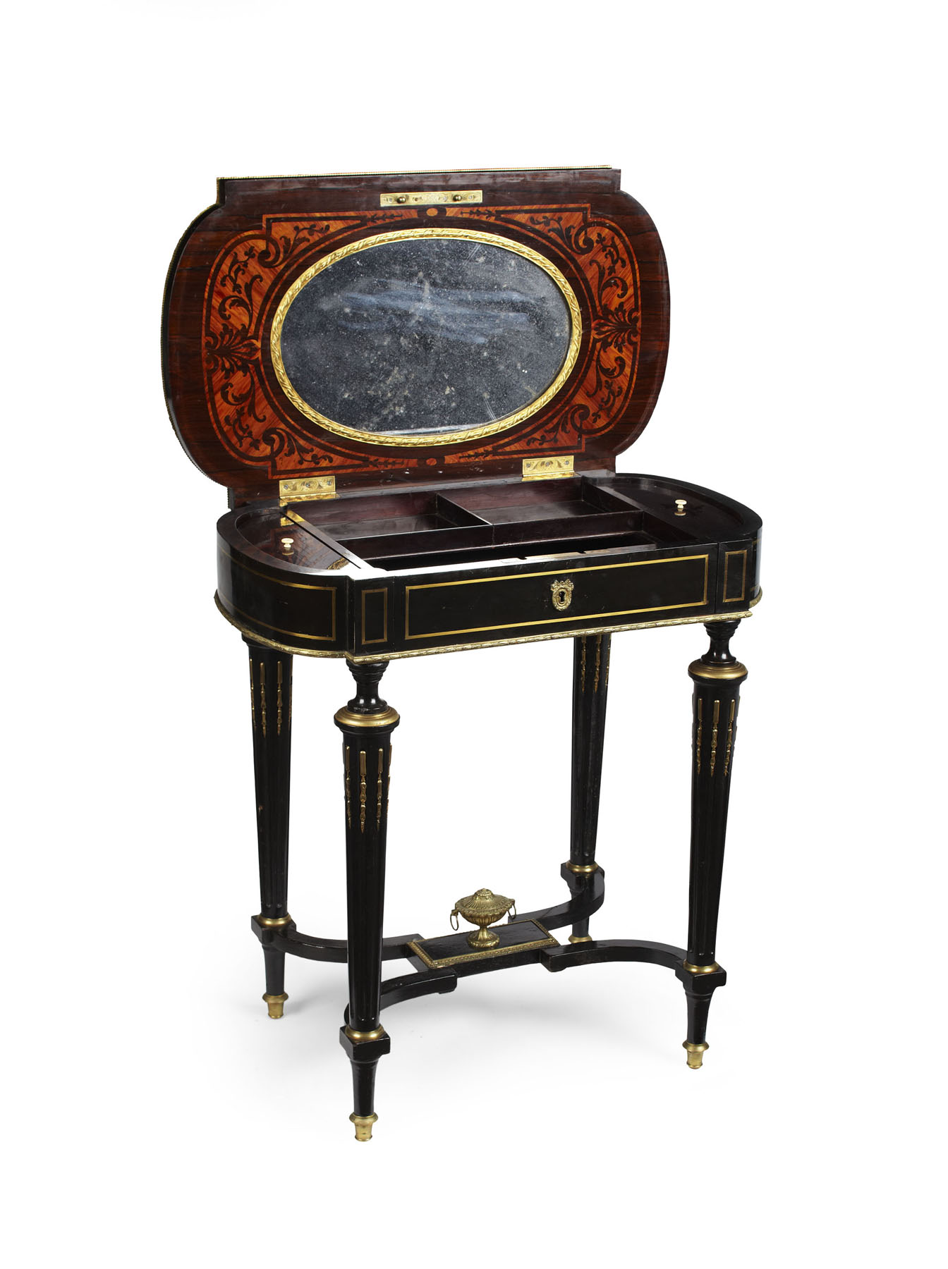 the hinged rectangular top with rounded ends and inlaid bands set with brass and abalone inlay floral medallions, opening to a fitted interior and drawer slide, the underside with foliate marquetry and an oval mirror; the whole raised on fluted tapered legs united by incurved stretchers centered by an urn finial.